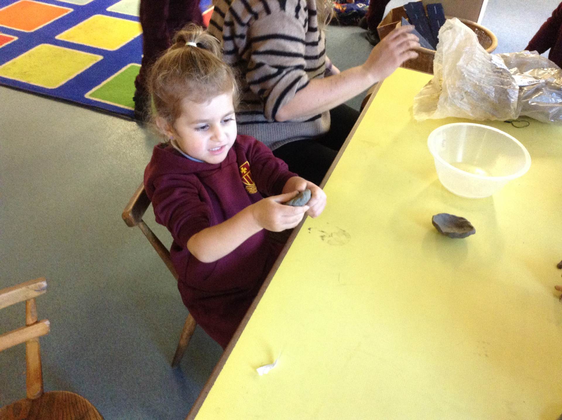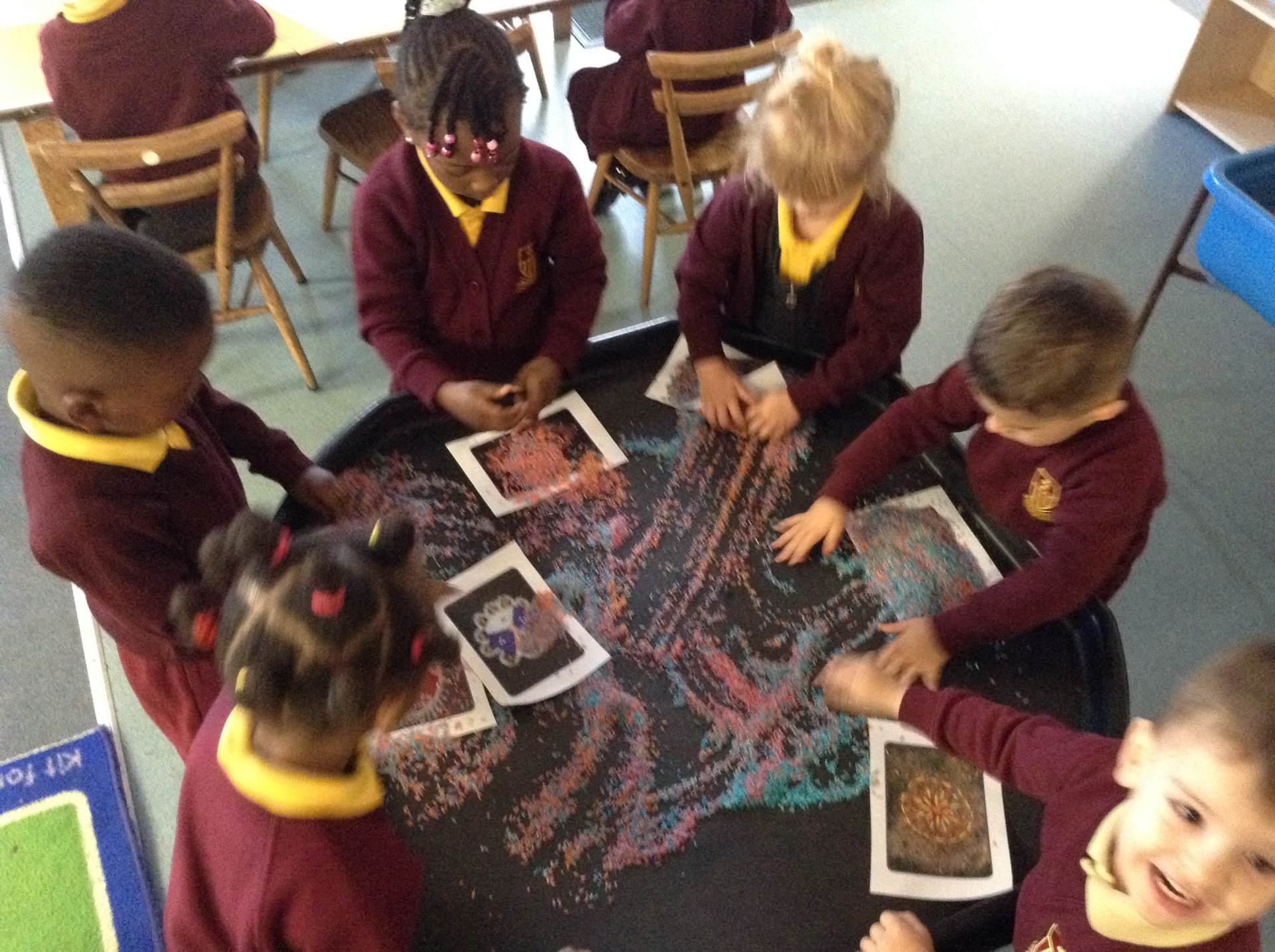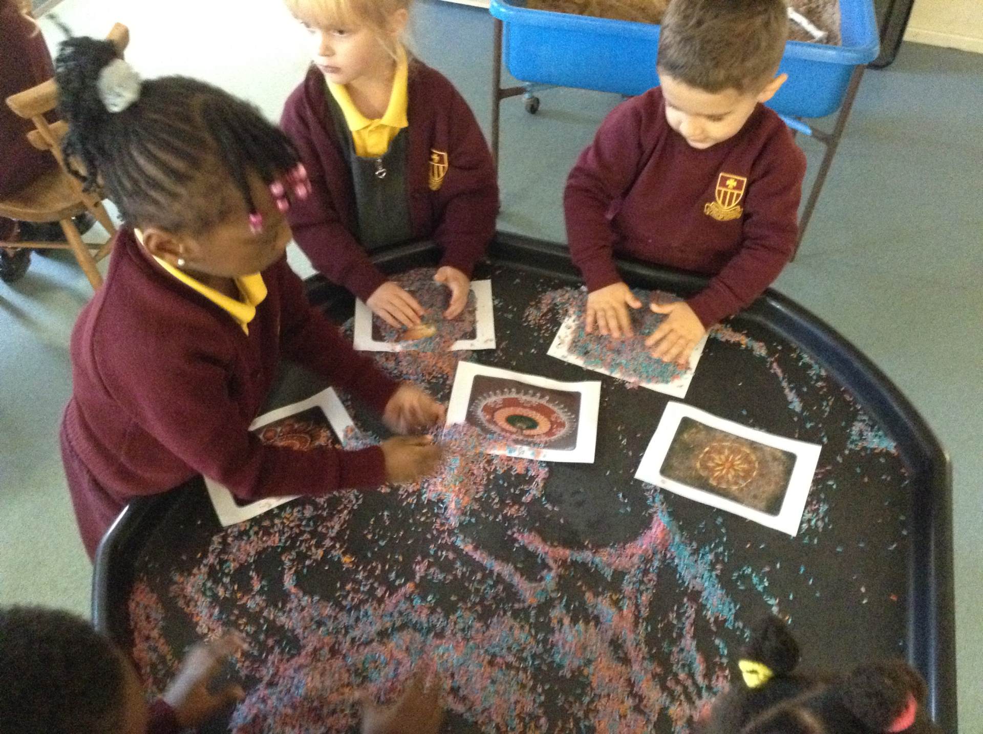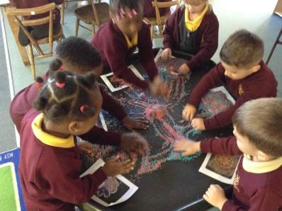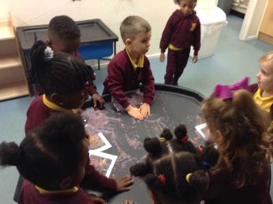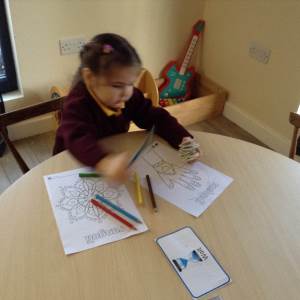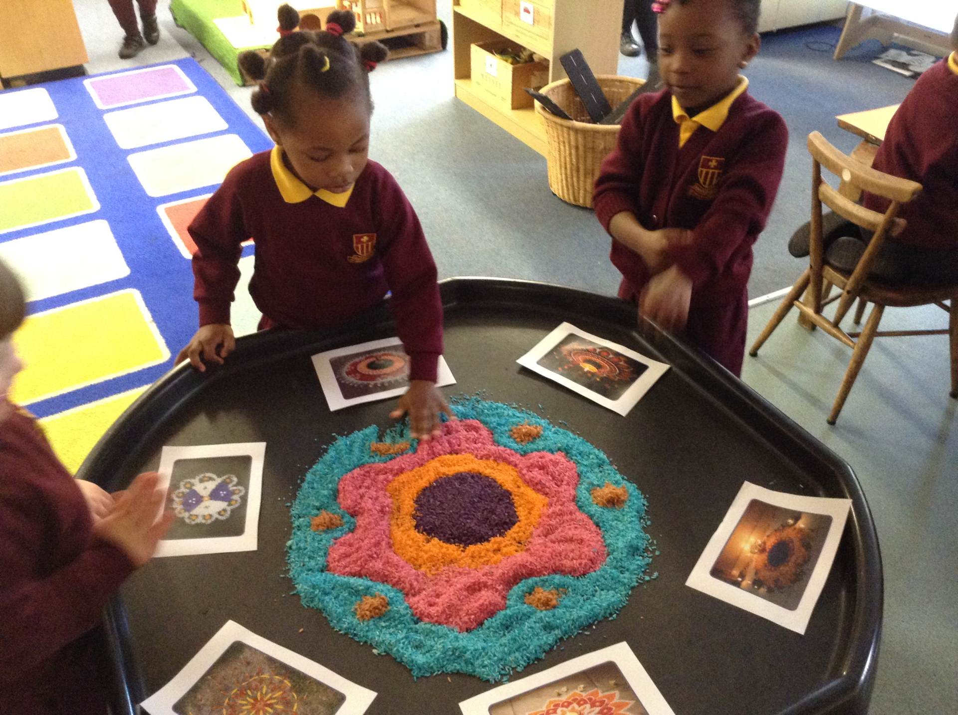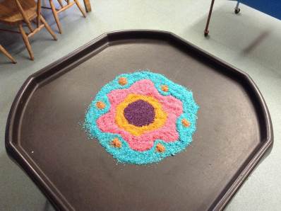 We heard about the celebration of Diwali through the sharing of pictures. We compared it to some celebrations we have across the year - Christmas and Easter. The children got to explore Rangoli patterns and got to try creating their own. Some children chose to create a diya lamp using bright colours and gems.