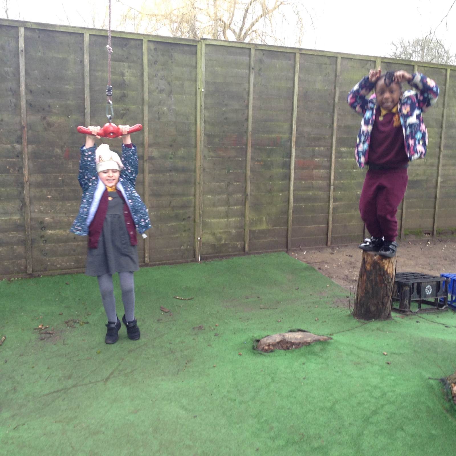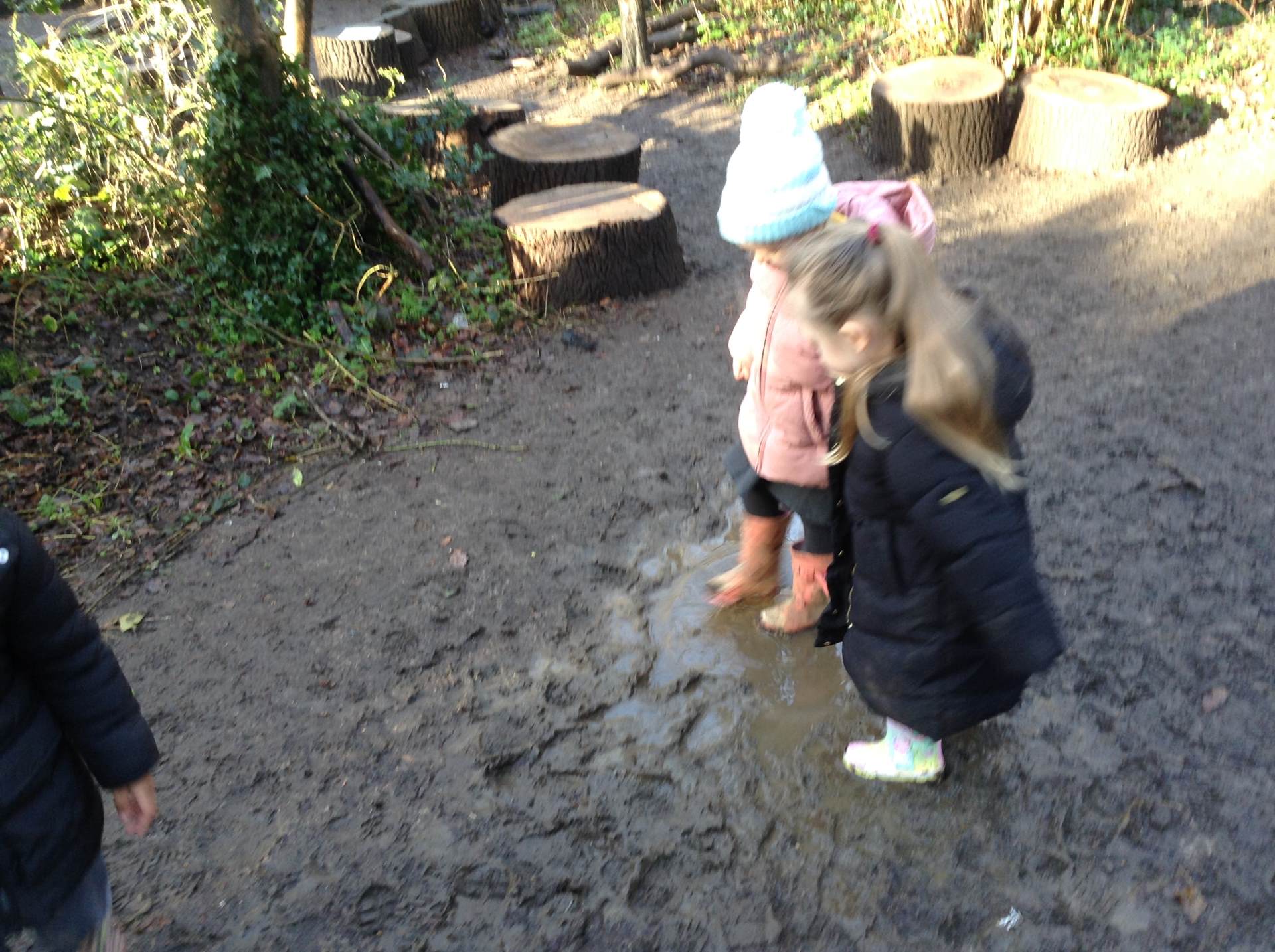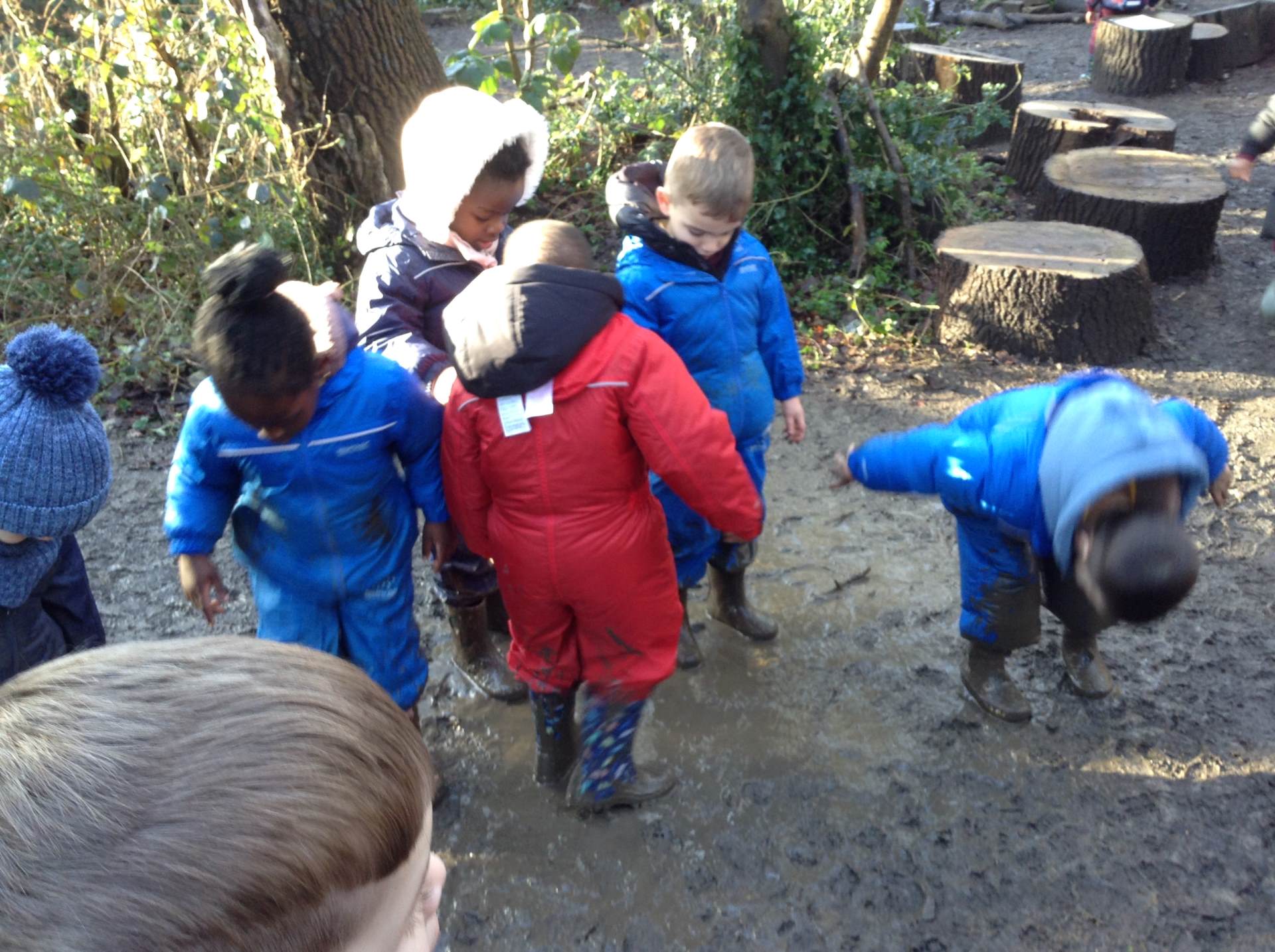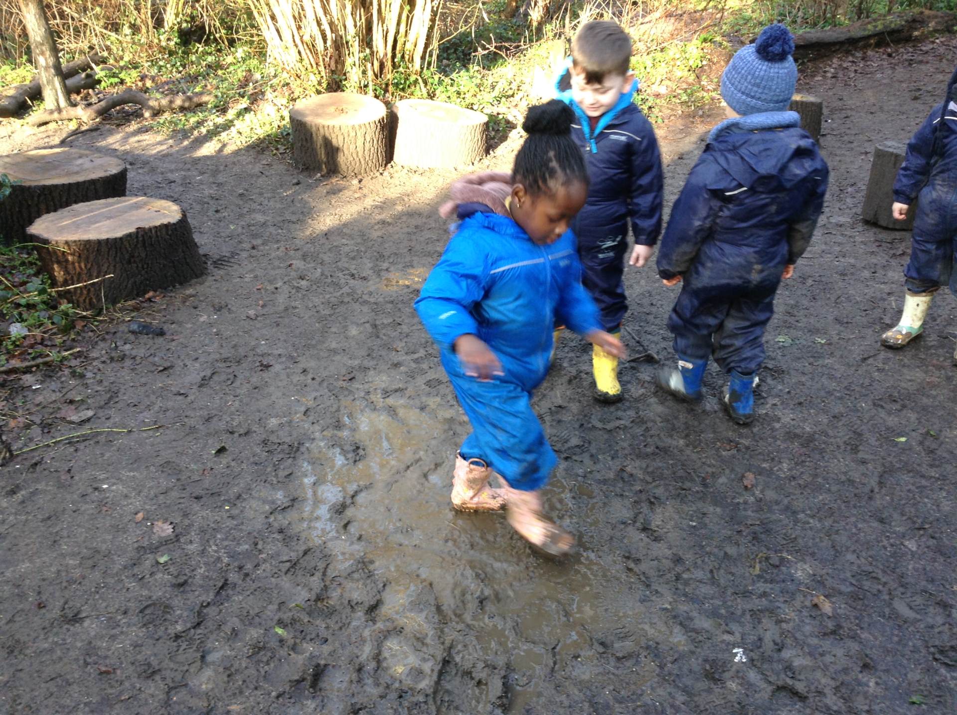 In Forest school, we spent the time exploring, encouraging the children to try different routes, climb over trees and jump down from logs and stumps. It was very messy but very fun!